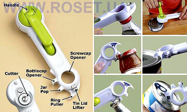 Як часто, для того що б відкрити зимову консервацію, Вам потрібно просити допомоги у чоловіка? Скільки часу займають пошуки потрібної відкривачки, що б відкрити улюблені шпроти? Скільки місця займають все відкривачки і ножі для консервних банок в кухонному ящику, а так само створюють там безлад? Вашій увазі ми пропонуємо Універсальна відкривачка Kitchen CanDo 6 в 1, який замінить собою всі відкривачки і стане незамінним помічником на кухні!