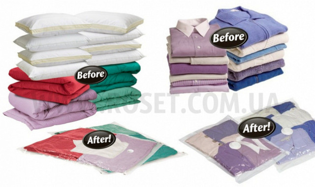 - выкачайте певний об'єм повітря з пакета, і тим самим зекономити місце в 3 рази;