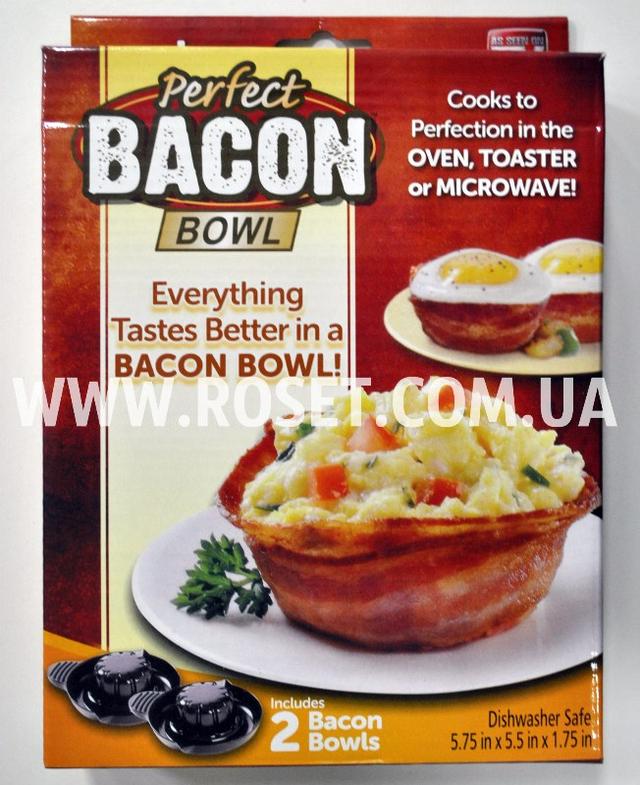 Виготовлені форми Perfect Bacon Bowl з міцного жароміцного харчового пластику з рифленою внутрішньою поверхнею, для легкого вилучення готового продукту з форми. Форма має ручку для вилучення її з мікрохвильової печі, духовки або електричної духовки.