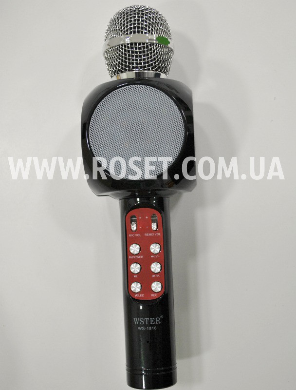 На ручці мікрофона розташовані кнопки, які відповідають за: вмикання і вимикання мікрофона, ехо (яке передає ефект звучання як у концертному залі), радіо FM ( достатньо двічі натиснути кнопку і мікрофон WSTER WS-1816 переключиться в режим радіо), перемикачі звуку і треків, також є кнопка запису, яка дозволяє мікрофону записувати ваш голос під час виконання пісень.